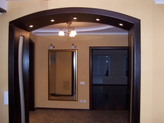 Le plus commun constructions en plaques de plâtre. À la base se trouve un cadre en métal auquel est fixée une cloison sèche. Ce type d'arches - le budget, d'ailleurs, assez simple à installer. C'est un bon choix à l'intérieur du minimalisme, où la porte ne doit pas détourner l'attention. Cette arche peut être complétée avec des étagères, des spots de plafond, faire une niche.