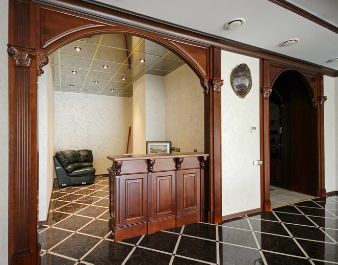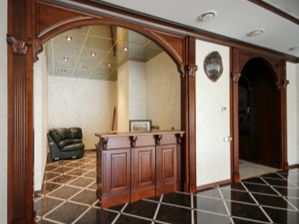 L'ouverture voûtée carrée est également un invité fréquent dans la conception de l'espace intérieur. C'est une bonne option pour le style de la pièce, où les lignes lisses ne prévalent pas et la version rectangulaire ne correspond pas à la largeur. Les supports latéraux d'une telle construction carrée peuvent être décorés comme des étagères ou des inserts en verre peuvent être utilisés. Les arches en bois, faites de bois avec des détails sculptés, sont incroyablement belles et majestueuses.