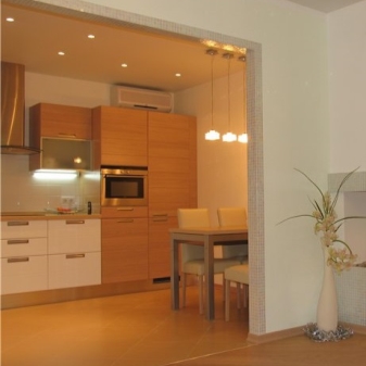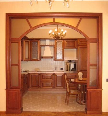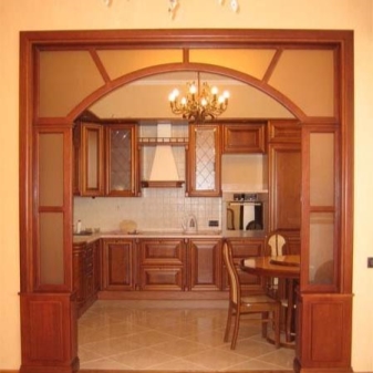 Les portails intérieurs sont pertinents dans la cuisine. C'est une option très pratique pour combiner la cuisine et la salle à manger ou le salon. Pour la cuisine n'a pas besoin de délices. Il s’agit généralement de simples arches lumineuses en placoplâtre ou en bois. Le portail rectangulaire est une bonne alternative à la porte de la cuisine.