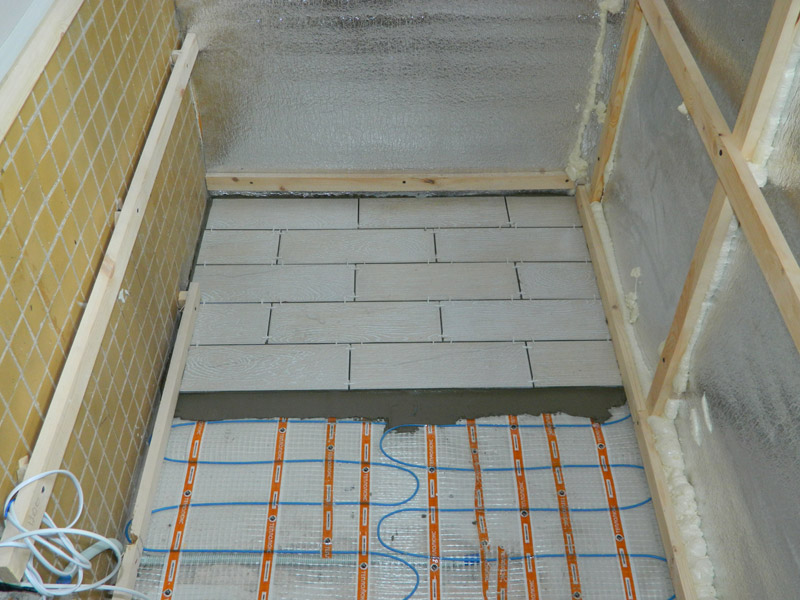 Cette option de plancher peut être faite sur le balcon ouvert. Il est préférable de ne pas abandonner le chauffage et d'appliquer l'une des options de chauffage au sol électrique. Pour que la pose des carreaux soit lisse et soignée, les experts conseillent d'utiliser des croix en plastique. À la dernière étape, ils doivent être enlevés et le coulis est fait.