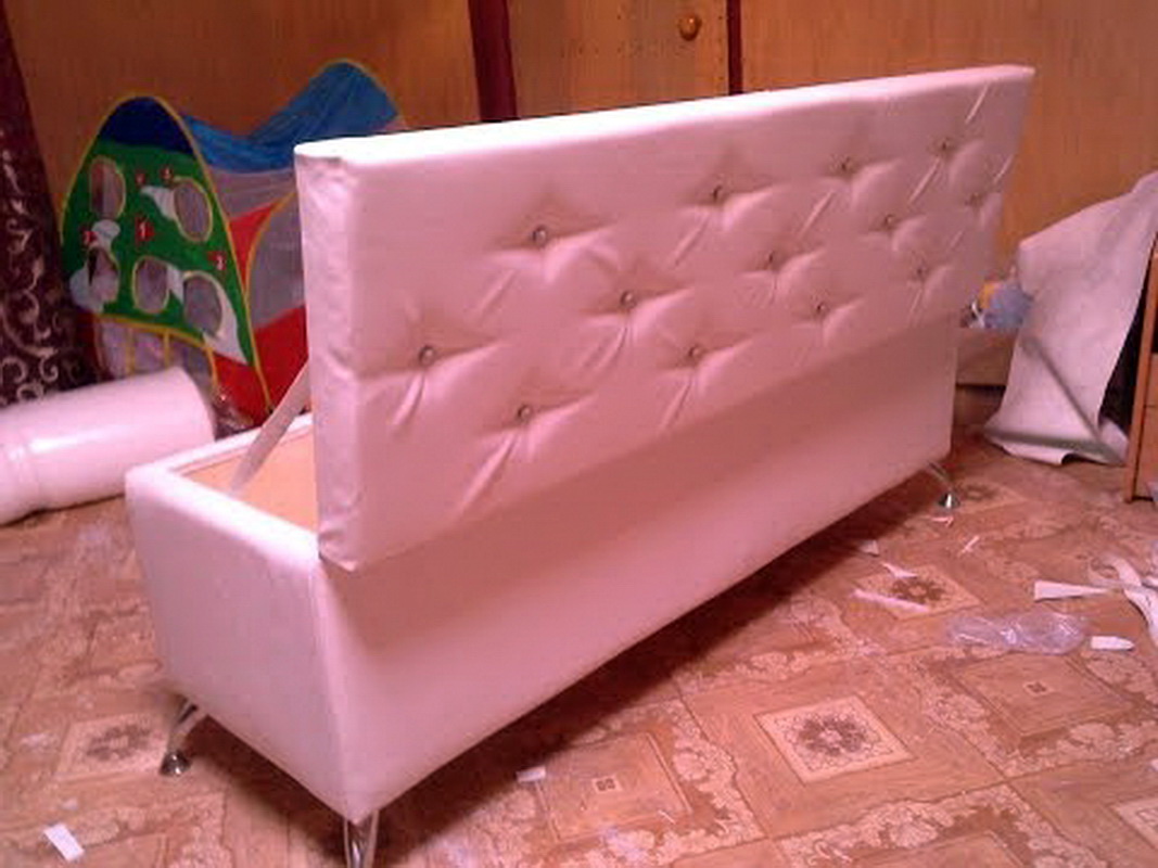 Il est nécessaire de fixer la construction à l'aide de coins de meubles, de vis et de colle. Le caoutchouc mousse est utilisé pour le remplissage, et tout tissu que vous aimez est utilisé pour le rembourrage. Mais vous devez comprendre que le tissu doit être durable et très résistant, pour ne pas s'user avec le temps. Si une chape à quatre faces est prévue, il est préférable d’utiliser non seulement du caoutchouc mousse, mais également un agent d’hiver synthétique.