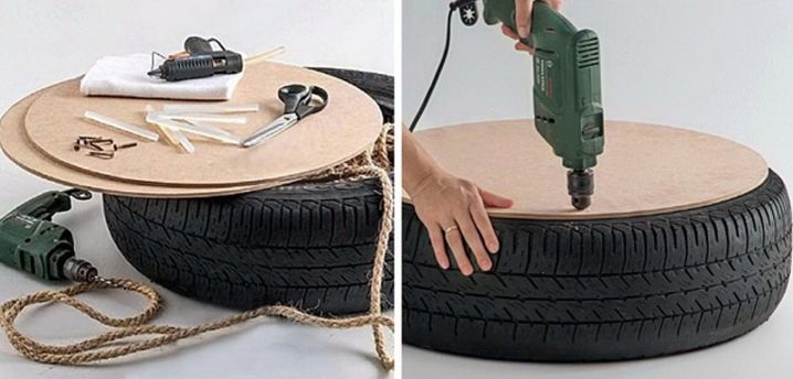 - Si le futur produit doit avoir des pieds, alors quatre assiettes doivent être fixées au fond, de manière à ce qu’elles dépassent de quelques centimètres du bord du tabouret. Il est nécessaire de fixer les pieds à l'aide de coins de meubles et de vis, vissés à l'aide d'un tournevis.