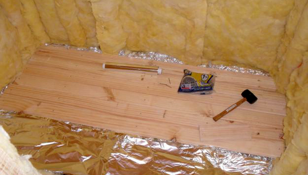 La feuille est fixée au plafond et aux murs avec un ruban adhésif spécial ou des boutons, et le matériau isolant est fixé avec des clous dans des bouchons en bois placés dans des trous prépercés.