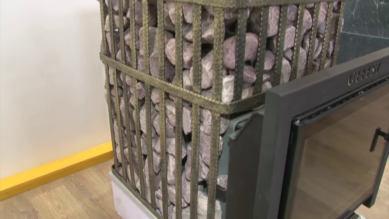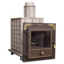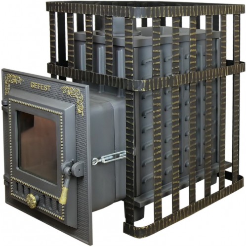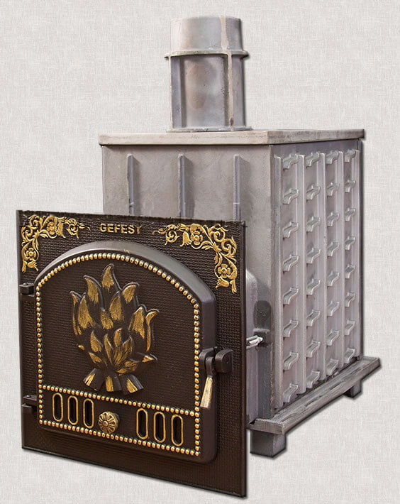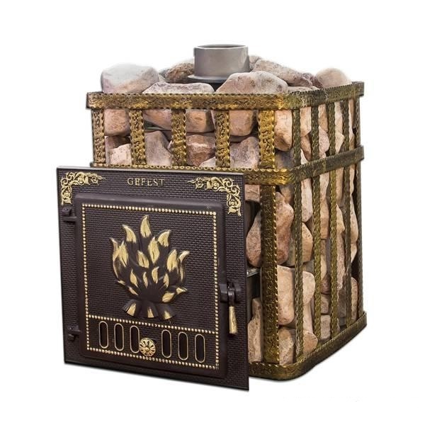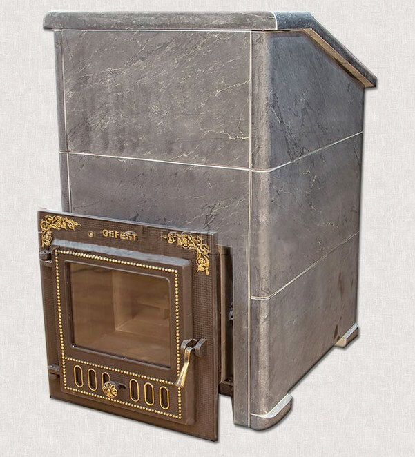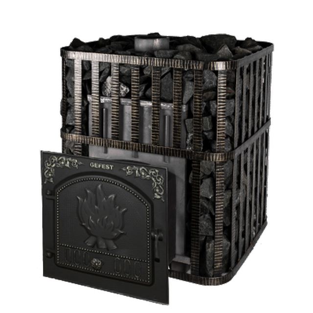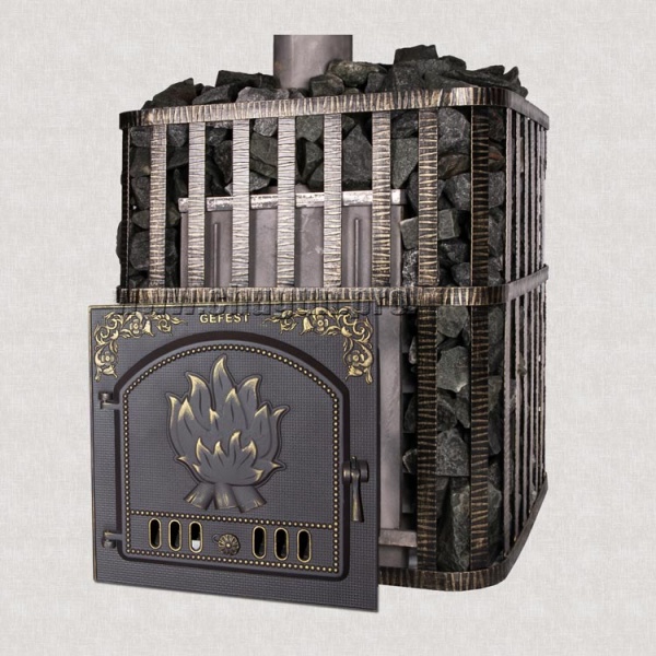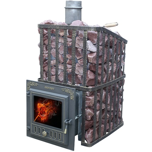 Bathhouse Les poêles Gefest sont disponibles en deux versions: avec un revêtement en bobine et une grille pour la pose de la pierre.