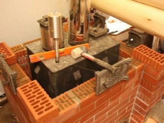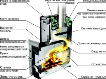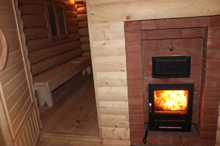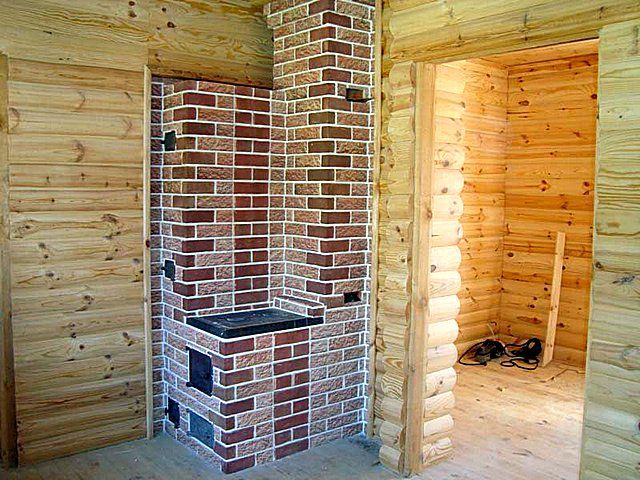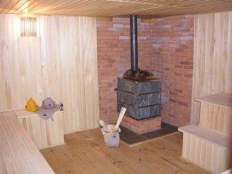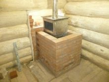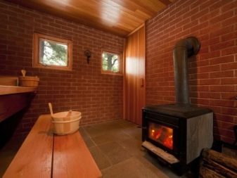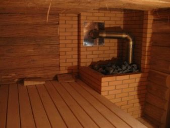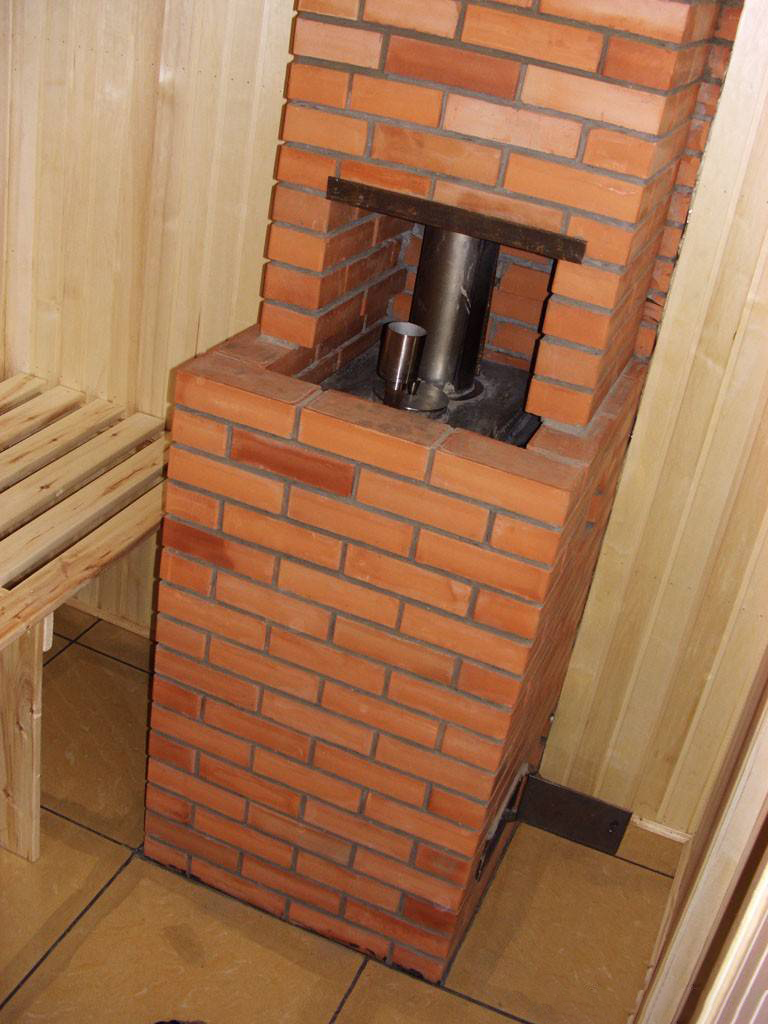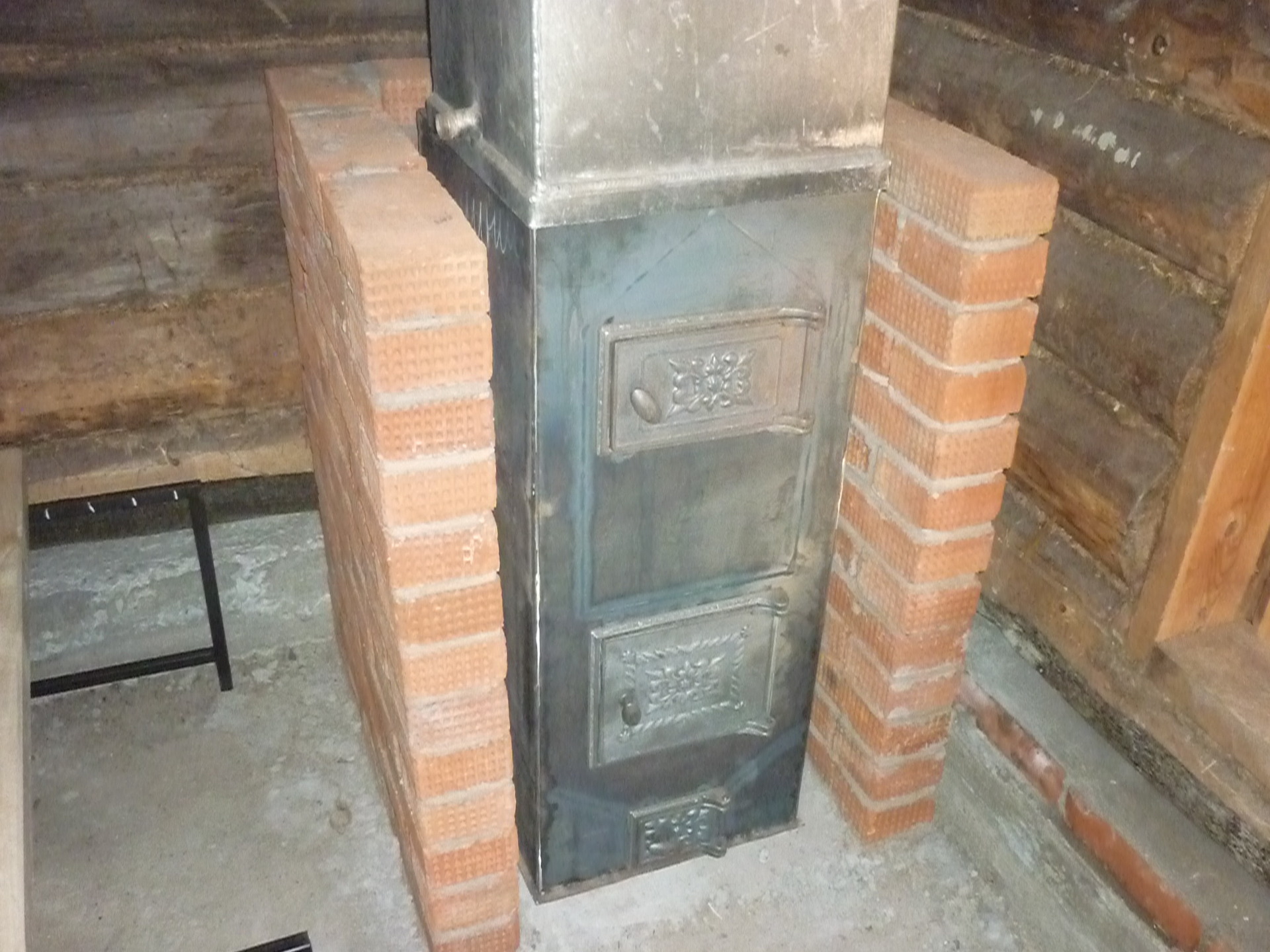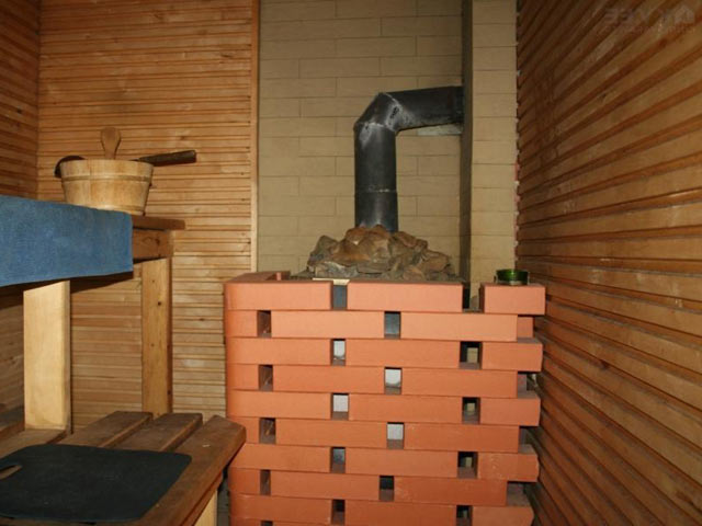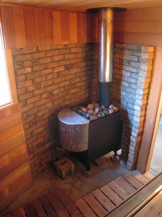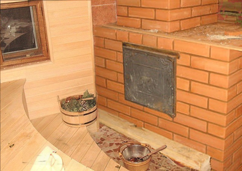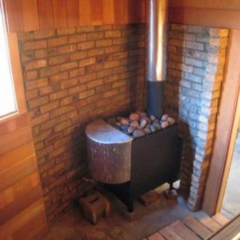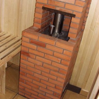 Pour augmenter la capacité calorifique et optimiser le transfert de chaleur, la base en métal est entourée d'une brique. Dans leur masse, ces fours sont «faits maison». La base de la conception est en tôle d'une épaisseur de 1,5 à 2 mm. Selon la configuration standard, la chambre de combustion est située dans la salle d’attente et l’appareil de chauffage dans le hammam. Les surfaces frontales sont recouvertes d'une couche de briques.