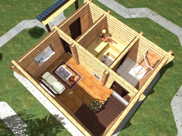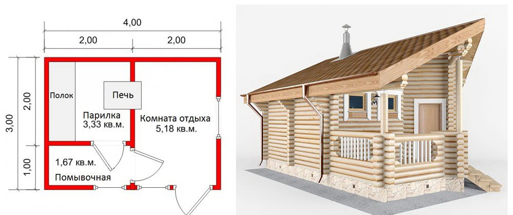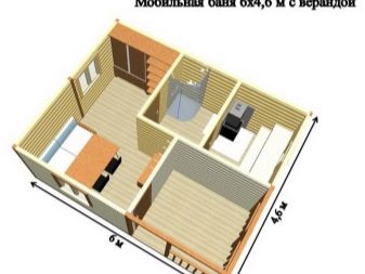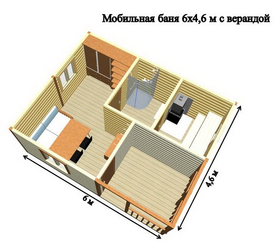 Et aussi un tel bain peut être équipé d'une petite véranda sur laquelle aménager un lieu de repos supplémentaire. Vu la véranda, la taille de la structure peut être de 4x3 mètres.