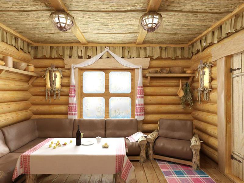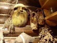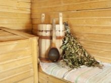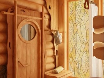 En choisissant un design ancien pour la décoration, vous pouvez apporter des ustensiles en bois (louches, bacs, bacs) à l’intérieur de votre salle de bain, acheter des meubles de salle de bain avec des sculptures ou des éléments forgés, décorer les murs et le plafond avec des faisceaux de balais et d’herbes aromatiques. Les accessoires textiles peuvent servir de tissage et de broderie.