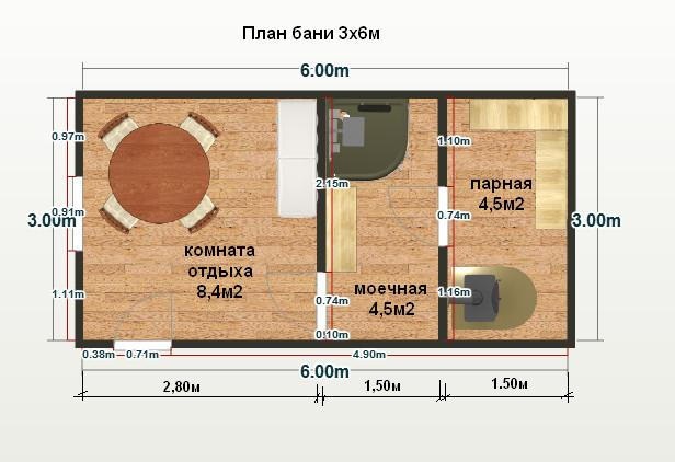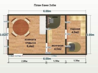 - La taille de 3x6 m est optimale pour la simplicité de la maintenance et de la maintenance du bain: une quantité minimale de carburant est nécessaire pour chauffer une surface aussi petite.