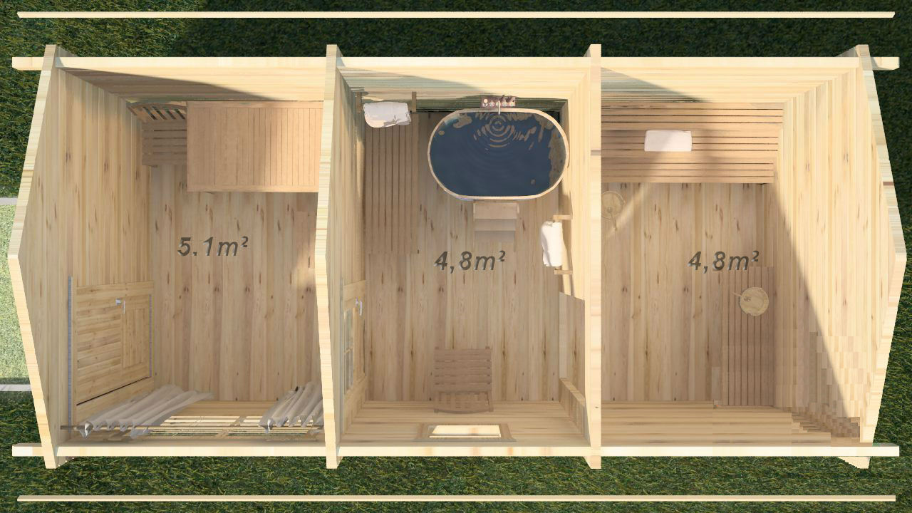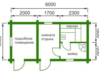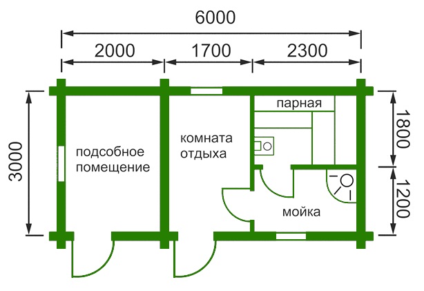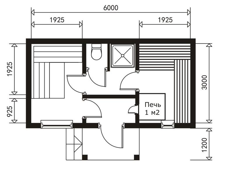 Ainsi, la surface de bain totale de 3 x 6 mètres à l'intérieur est d'environ 22 m², alors que la surface utile sera d'environ 17 m². Dans un tel bain, pas plus de quatre personnes pourront rester en même temps. Une des configurations les plus pratiques peut être cette option.