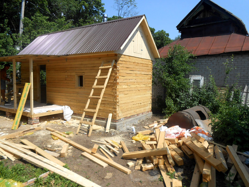 Une buanderie sous le même toit avec une baignoire vous évitera de construire un stockage supplémentaire de carburant sur votre site. Entre autres choses, le bois de chauffage avec cette méthode de stockage restera toujours sec, quelles que soient les conditions météorologiques. Avec cette configuration, il est facile de placer un canapé ou des chaises longues, une table, toutes sortes d'accessoires de salle de bain et accessoires dans une salle de repos d'une superficie d'à peine plus de 5 m².