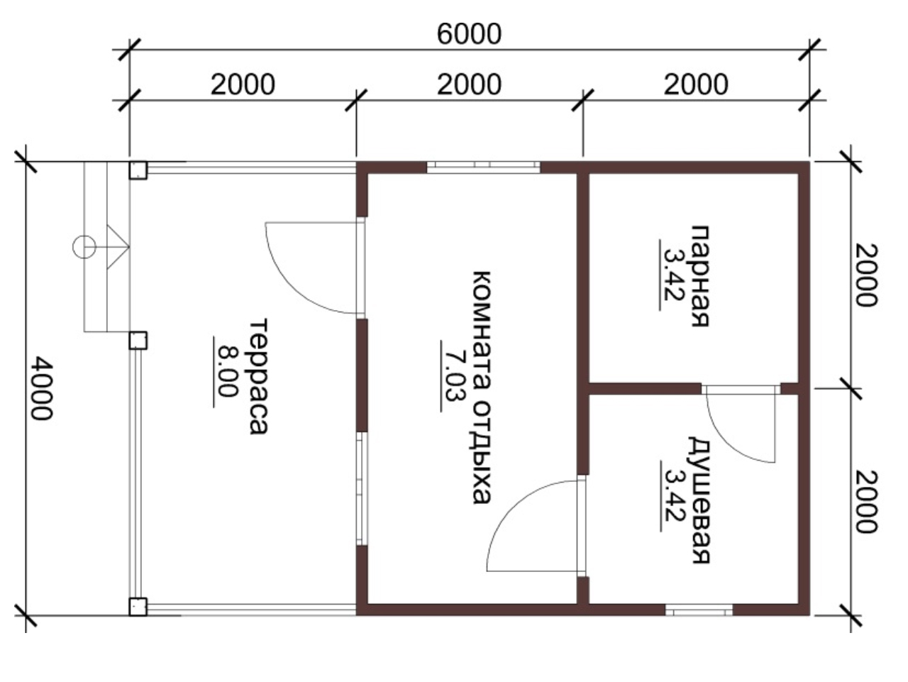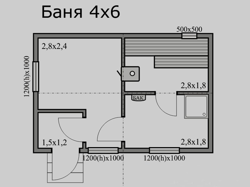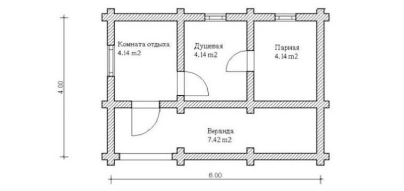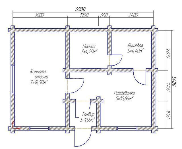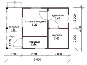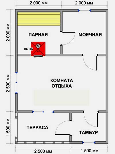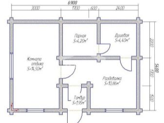 Pour élaborer un dessin de la future structure, vous devez penser à l’avance à l’emplacement et à la taille des pièces. Par exemple, la surface de la salle d'attente, qui empêche la pénétration d'air froid dans la pièce, est mesurée au taux de 1,3 m² par personne, plus le lieu où les objets et les accessoires de bain seront stockés.