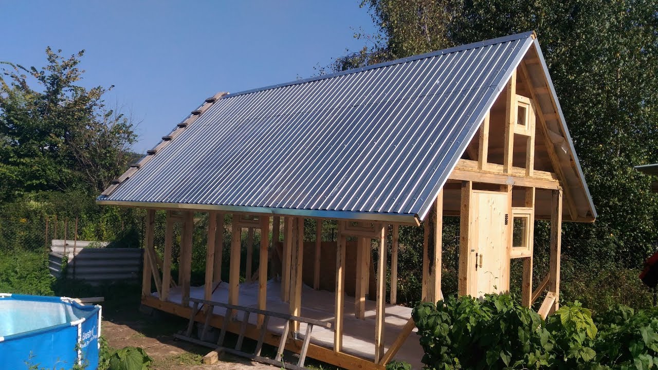 Une fois que la hauteur des murs atteint le niveau requis, vous pouvez procéder à la construction du toit. Avant de commencer tout travail de toiture, vous devez fermer les poutres de plafond avec des planches. Tout d’abord, vous devez vérifier toutes les dimensions de la couronne supérieure (ou de la rangée) de sorte que les murs opposés soient strictement parallèles les uns aux autres.. Ensuite, réglez les chevrons, le lattage, la toiture, le système de drainage.