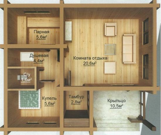Actuellement, le marché offre un grand nombre de projets pour tous les goûts et tous les budgets. La conception optimale est un projet de bain de 4 x 6 m. Il peut fournir une salle de repos, un hammam et une douche d'une taille telle que 5 à 6 personnes peuvent se laver, prendre de la vapeur et se détendre confortablement.