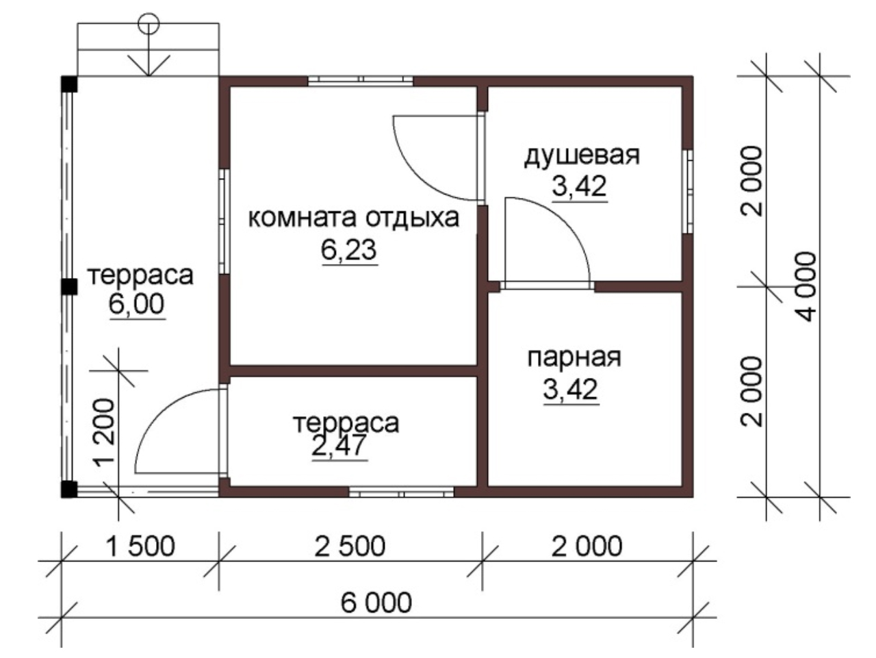Le programme de bain 4x6 n'est pas seulement un hammam et une salle de lavage.Il peut être équipé d'une véranda fermée pour un passe-temps confortable pendant la saison froide, d'une terrasse ouverte pour se détendre en été.