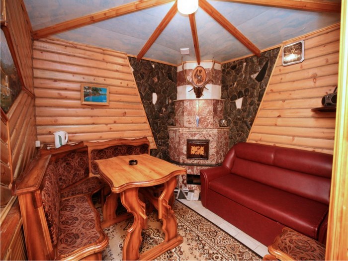 L'intérieur de la salle de repos peut comprendre non seulement une table et des chaises, mais également des canapés confortables, une télévision et des armoires pour ranger les accessoires de la baignoire.