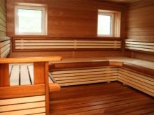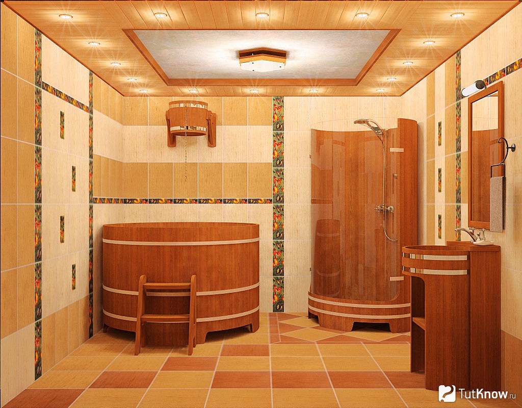 Le cadre peut être fait n'importe lequel, mais de l'intérieur, la peau est en bois. Il est important de comprendre que lors du calcul de la surface utilisable, il est nécessaire de prendre en compte l'espace occupé par le mobilier. La hauteur du hammam est habituellement d’environ deux mètres, la hauteur des autres pièces pouvant aller jusqu’à trois mètres. De telles dimensions vous permettent de placer tout l'équipement et le mobilier nécessaires.