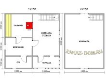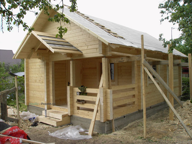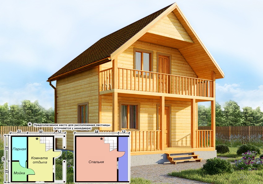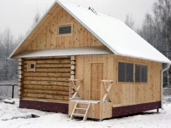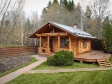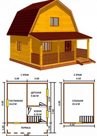 Le bain peut également être fait sur deux étages. Son toit peut être n'importe lequel. Souvent, ils fabriquent des objets similaires avec des toits en forme de tour ou de hanche, qui ont l’air assez originaux sur le site. Au deuxième étage, les chambres sont aménagées pour la nuit et une terrasse peut également y être installée.
