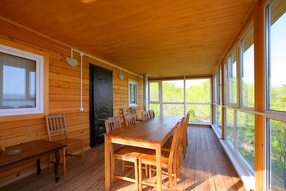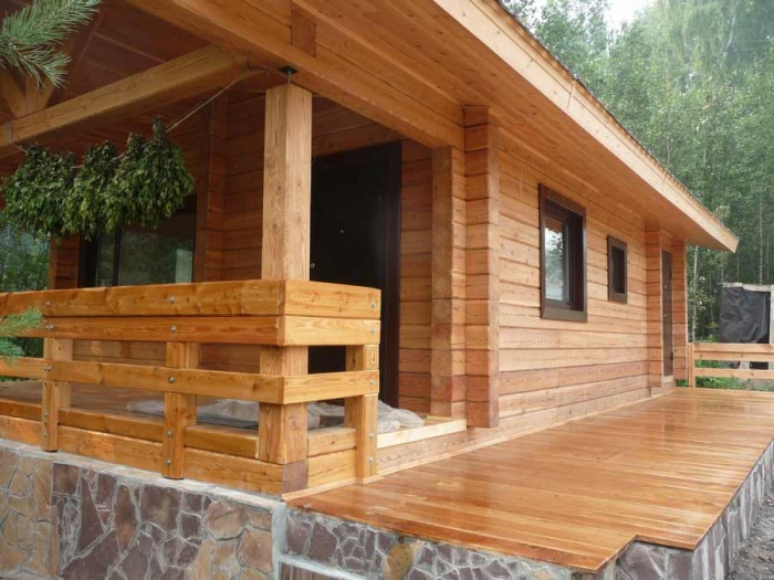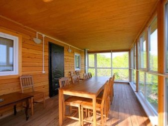La présence d'une véranda est un moment important dans l'industrie du sauna.La véranda peut être un endroit où il fait bon se reposer pendant une saison chaude ou même froide. Les murs de la terrasse peuvent être isolés, des fenêtres à double vitrage doivent être installées dans les ouvertures des fenêtres. Terrasse en été au rez-de-chaussée peut effectivement protéger de la pluie.