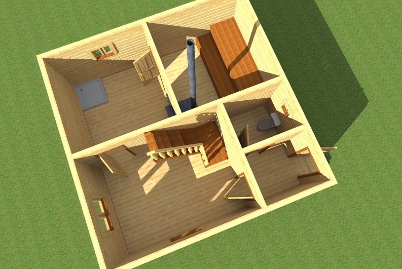 Les chambres sont faites sur un projet individuel, chaque propriétaire sait mieux combien de personnes se reposeront en même temps, comment planifier au mieux une salle de repos et un hammam.Pour une mise en page plus rationnelle de la maison en rondins, utilisez des techniques traditionnelles. Le poêle est situé près du mur adjacent au salon d'angle. Dans le même temps, nous ne devrions pas oublier la sécurité incendie. Le trou de la chaudière est généralement affiché dans la salle d'attente.