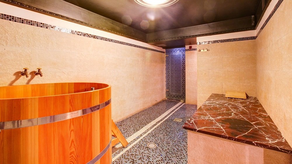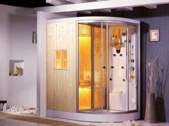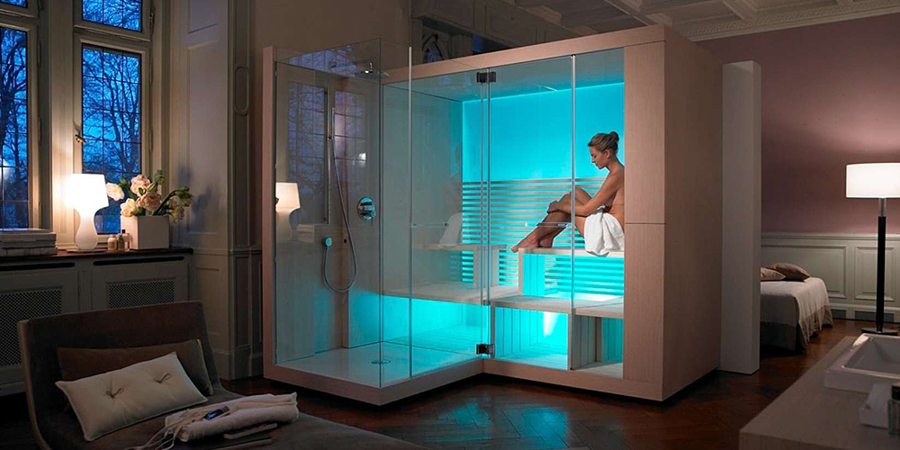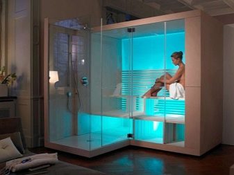 Un hammam dans un sauna prend très peu de place, puisqu'un four électrique est chauffé pour maintenir la sécheresse de l'air et qu'il y a suffisamment de sièges, car ils ne sont pas cuits à la vapeur avec des balais. Pour se rafraîchir et se baigner, utiliser une douche ou une piscine. En tant que tel, le local technique du sauna occupe une pièce très limitée et peut donc être logé dans une cabine en verre spéciale située dans la salle de bain d'un appartement de ville.