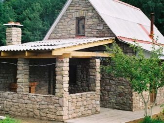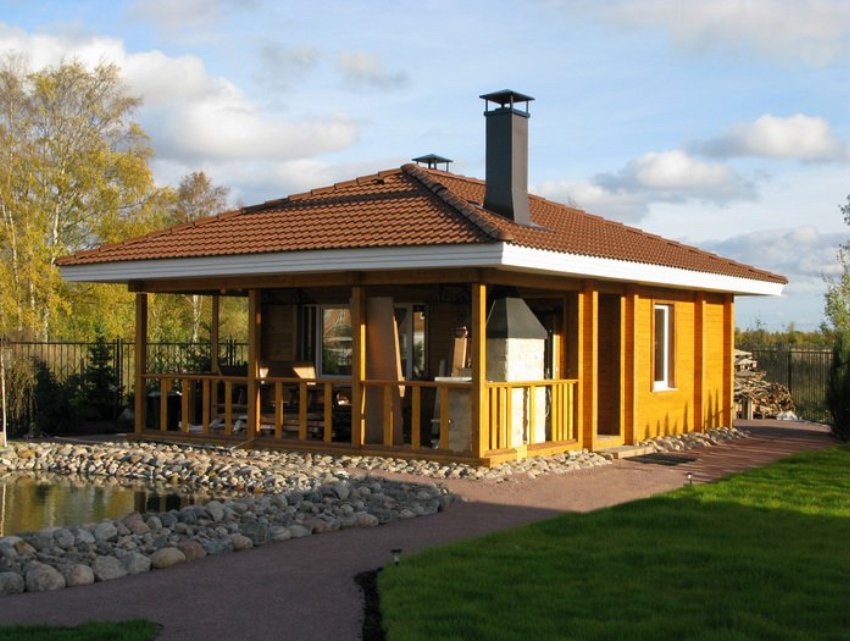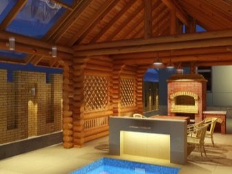 Une attention particulière doit être portée aux équipements principaux avec une terrasse barbecue sous un même toit avec une baignoire. La chambre de combustion est installée de manière à ce que la fumée ne pénètre pas dans les fenêtres ni dans la salle à manger. Pour ce faire, maintenez une distance d'au moins deux mètres de la table et des fenêtres. Le mur autour du brasier est garni d'un matériau réfractaire, de la pierre ou des briques. Pour un tel bâtiment, vous devez disposer d'un espace libre sur le site et d'investissements financiers importants.