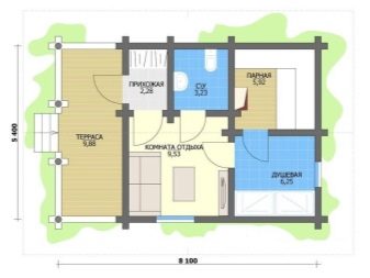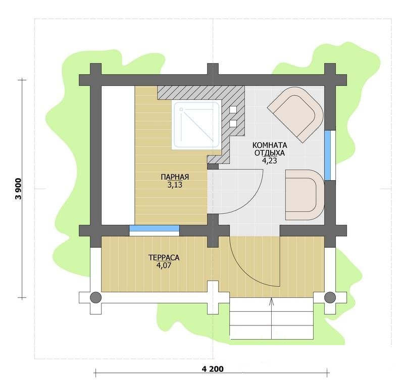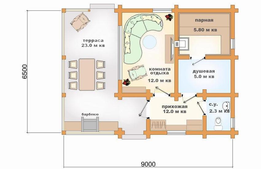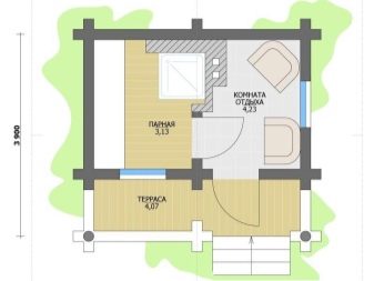 La construction de saunas sur un site de pays offre de nombreuses possibilités de créativité. La baignoire de petit budget est parfaitement capable de se construire ses propres mains. Sur le domaine de 10-12 mètres carrés. les compteurs conviennent à tout ce dont vous avez besoin, la petite taille permettra d’économiser du chauffage, un petit salon en été s’agrandit aux dépens de la véranda. Le projet le plus simple d'un établissement thermal avec une véranda comprend un hammam, une salle de douche et une salle de détente ou vestiaire et une terrasse sous un hangar.
