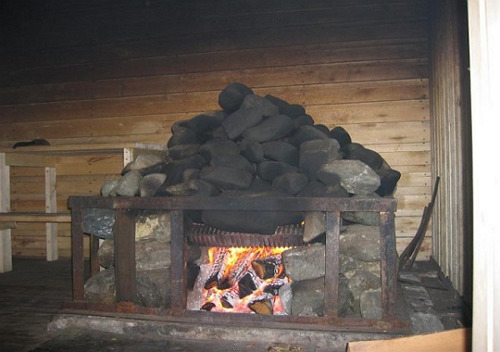 Historiquement, le sauna finlandais est un espace bas, fermé et petit, de 2 à 6 à 8 mètres carrés. m, conçu pour 2-3 personnes. Autrefois, ces bains étaient chauffés par un foyer au centre de la pièce avec des pierres chaudes. La cheminée elle-même était absente, la ventilation a été réalisée à travers la porte ouverte et le flux entrant près du sol. La chambre était très sèche et chaude.
