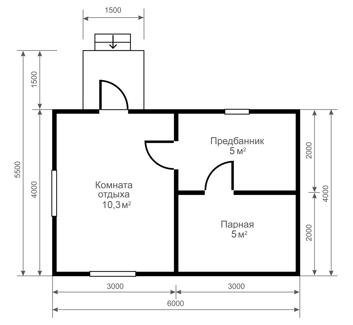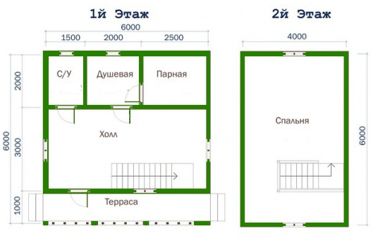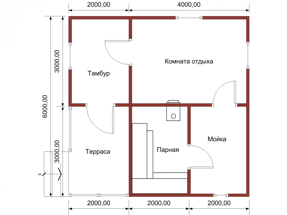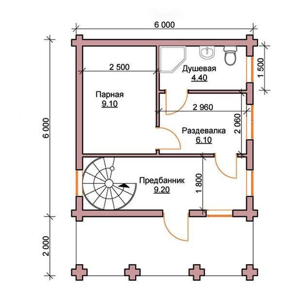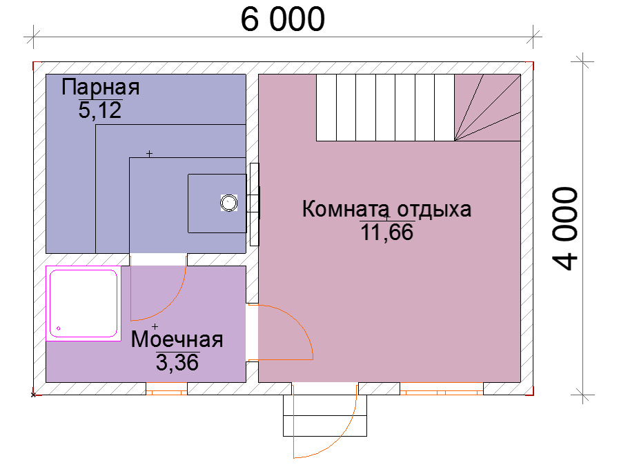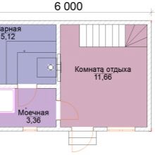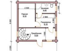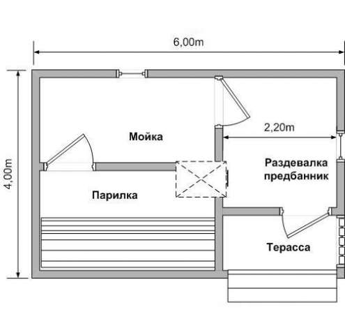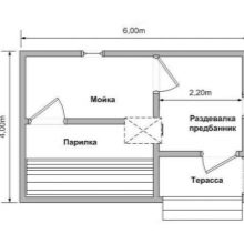 Le projet standard gratuit le plus demandé est un blockhaus pour un bain mesurant 6 mètres sur 4.. C'est une excellente option, qui fournit toutes les salles nécessaires pour une utilisation confortable du sauna. De plus, c’est dans la conception de ce type que le placement d’un poêle avec du bois de chauffage est extrêmement pratique. Il servira de source de chauffage supplémentaire.