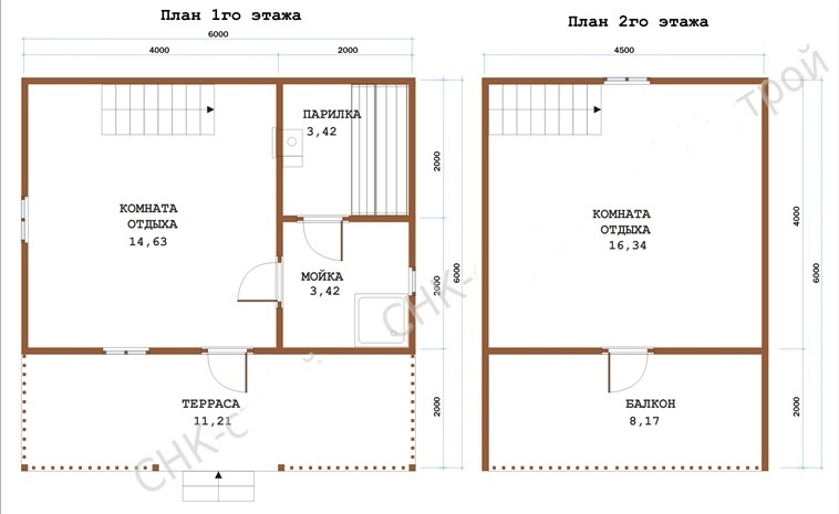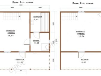 Si vous souhaitez construire un lieu plus confortable où vous pourrez passer du temps avec vos amis et votre famille, il est recommandé d'équiper la salle de bain d'une chambre d'amis. Pour ce projet, une maison en rondins de deux étages avec une véranda est parfaite.Les dimensions de ce sont également 6 par 6 mètres. Un espace supplémentaire, apparaissant au deuxième étage, peut être laissé sous la salle de repos. La table de billard ou la bibliothèque s'intégrera parfaitement dans cette atmosphère.
