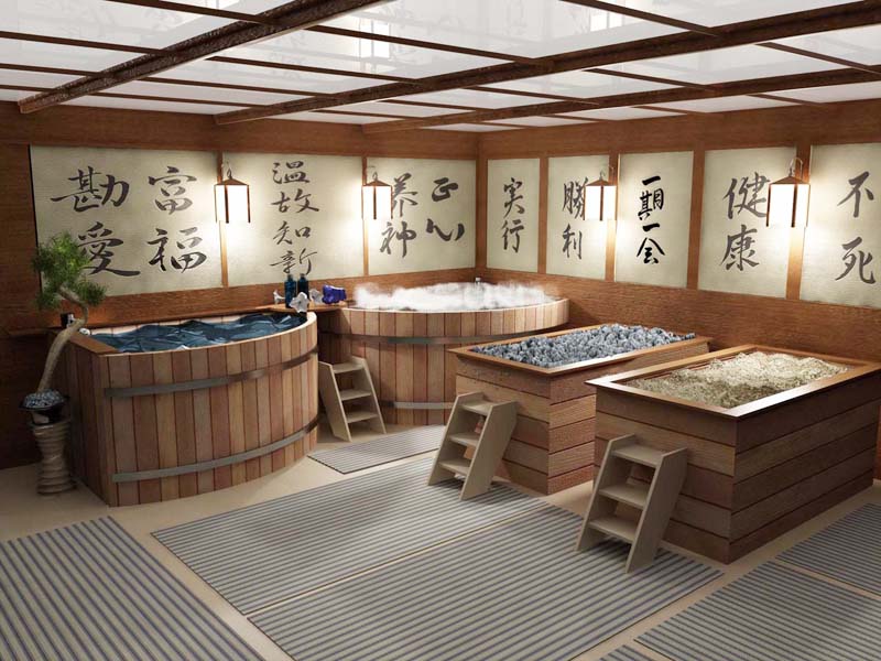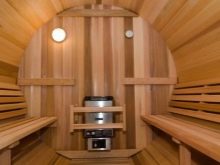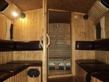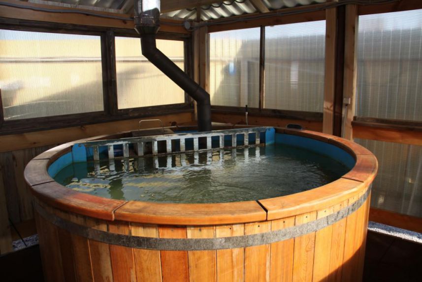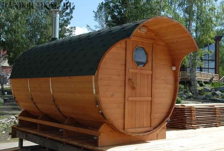 Le choix initial sera un sauna sur roues et un sauna en forme de tonneau en bois. Tonneau de bain rond pouvant servir de bain finlandais, bain de vapeur russe ou ofuro japonais. Le bain russe comprend un hammam et une salle de lavage et est situé sur une légère pente. Le filet avec le radiateur se dirige vers le hammam et le réservoir pour le chauffage et la chambre de combustion elle-même est situé dans la salle de lavage.Le sauna finlandais sec est situé dans le même espace et à la sortie des nageurs en attente d'un récipient rempli d'eau. Le bain ofuro n'a pas de toit. Il est installé sur une plate-forme en bois. À l'intérieur, les sièges sont en bois et le poêle est fermé par une cloison afin de ne pas être brûlé.