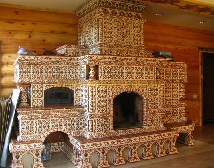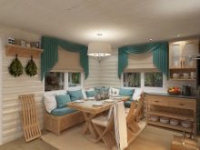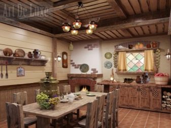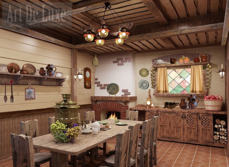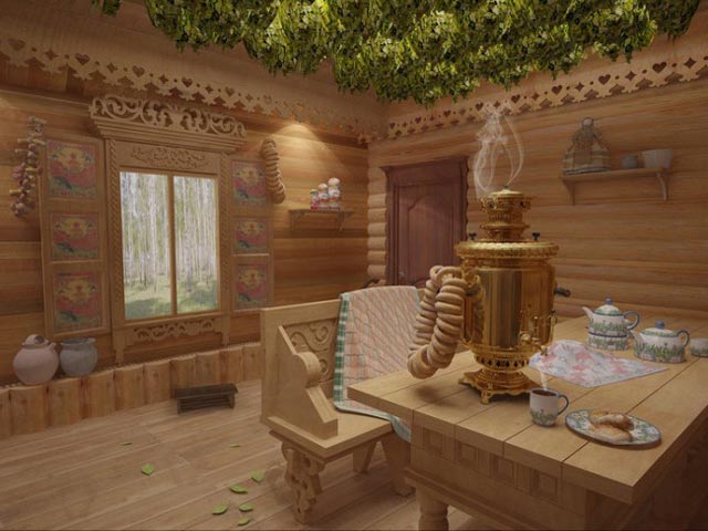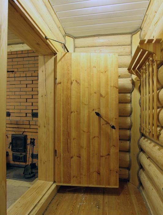 Assurez-vous de mettre un poêle en pierre, tapissé de tuiles.Les bois clairs et les éléments en métal, les articles ménagers et les accessoires sont choisis - balais, cuves en bois, coffres et samovars.