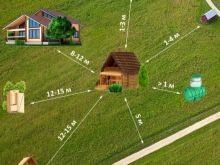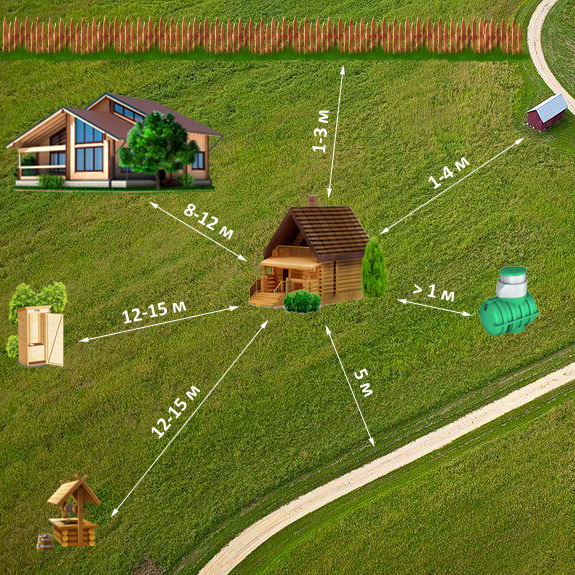 Il existe également des exigences relatives à l'espace entre le bain et les bâtiments les plus proches. Le bain doit être situé à au moins 10 mètres de la maison et à 3 mètres de la limite du pavillon d’été, c’est-à-dire la clôture, afin de permettre l’accès au bâtiment de tous les côtés en cas d’incendie. La distance au puits devrait être d'environ 20 mètres.
