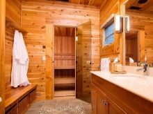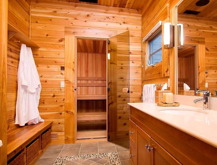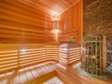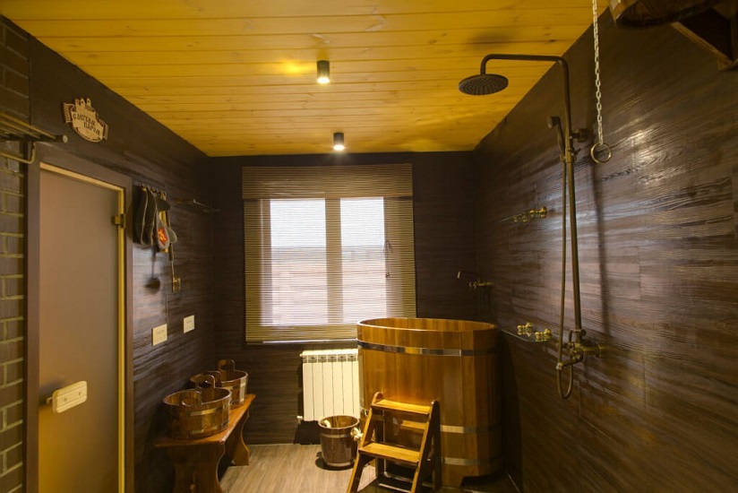 Bien sûr, en matière d’enregistrement du bain, la majorité votera pour les locaux russes traditionnels. La salle de repos ou le dressing est décoré de meubles en bois sculpté, le four de la cheminée y est également présenté. Les petites fenêtres sont décorées de plateaux et de rideaux à fleurs. Un hammam peut être combiné avec une station de lavage dans un espace et suspendre au plafond un seau en bois rempli d’eau froide, qui remplacera le trempage dans le trou.