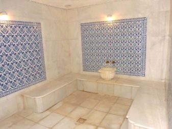 Si la communication «après le bain» est importante pour eux, une grande zone est allouée à une salle de repos. Si - le processus lui-même, qui se déroule dans le hammam -, il devient une priorité, tout comme l'évier. Les lavages eux-mêmes peuvent varier en taille et en fonction: ils ne disposent que d’une douche et d’une paire de bancs, ou bien d’une police de caractères. La même chose peut être dite à propos des hammams: dans les saunas, ils sont petits et "sédentaires" et dans les bains traditionnels traditionnels - spacieux et "couchés", équipés d'un grand nombre d'étagères.