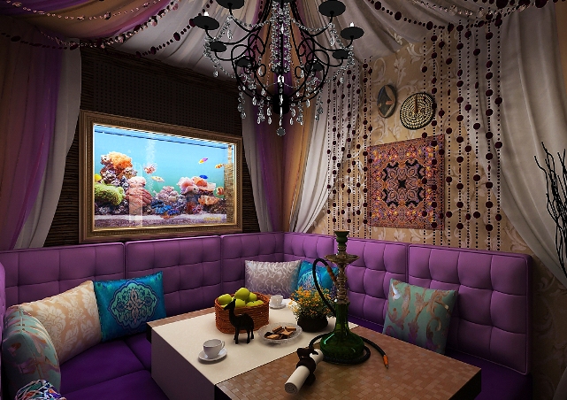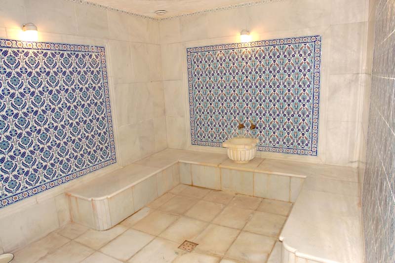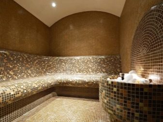 Les amoureux de l’Est, avec de l’argent, peuvent organiser un hammam et le bain dans le style turc. Le sauna oriental traditionnel, appelé hammam, est chauffé par un lit en pierre situé au centre de la pièce. Une «cascade» est souvent formée sur le mur, qui joue le rôle de la lessive. Vous pouvez ici vous rincer après un long séjour dans une pièce chauffée. L'air dans le hammam a une température confortable, ce qui permet d'effectuer une variété de traitements de spa et de massages. Parmi les éléments de décoration, un tel bain nécessitera un éclairage au néon, des bancs spéciaux, des carreaux ornés d’orientaux et des mosaïques. Dans la salle de repos, vous pouvez aménager une salle pour le narguilé, suspendre des rideaux lumineux, installer une table basse sur des pieds courbés et disperser des coussins colorés.