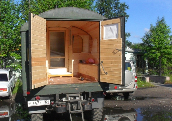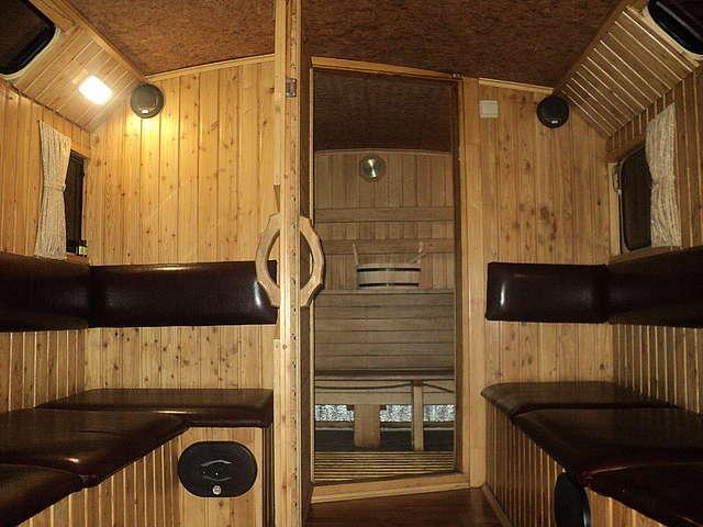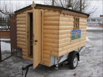En règle générale, les cabines de bain sur roues sont louées par de grandes entreprises composées d'amis ou de parents qui choisissent la nature. Une telle baignoire peut être raccordée à une voiture de tourisme à l'aide d'une remorque uniaxiale, d'une remorque à deux essieux ou sur la base d'un camion lourd. À l’extérieur, ce bain est généralement décoré de panneaux de bois et décoré de lampes au kérosène, de plateaux sculptés et de marches ordonnées. À l'intérieur, le hammam est recouvert de papier d'aluminium, puis de clins en bois de feuillus. Toutes les pièces sont soigneusement fixées afin de ne pas bouger pendant le voyage. Les étagères sont pliables ou rétractables pour économiser de l'espace. En général, un sauna sur roues n'est pas très différent d'un sauna fixe. Ses principaux avantages sont qu'il n'est pas nécessaire de construire une fondation, d'obtenir une autorisation pour des travaux de réparation et qu'il est possible de placer le bâtiment absolument n'importe où.