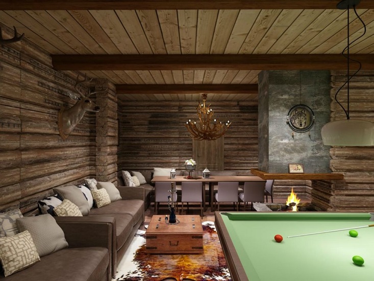 Il n'y a pas d'exigences particulières pour le choix des matériaux pour la décoration d'une salle de repos, l'aspect esthétique est plus important ici. Par exemple, dans les bains de style chalet, le sol est assemblé à partir de planches massives qui ne sont ni peintes ni vernies. Les murs sont recouverts de plâtre ou de bois, de grandes poutres de plafond en saillie sont nécessairement présentes. Le mobilier est vieilli, simple, avec des surfaces non traitées. La cheminée est obligatoire.Parlant des meubles, généralement pour un bain, des chaises longues et des étagères, des bancs et des bancs, des armoires et des cintres, des tabourets, des chaises et des tables sont fabriqués ou fabriqués. Tous les éléments intérieurs doivent être sûrs, durables et multifonctionnels. Les étagères standard pour un hammam mesurent 185 cm de long, 65 cm de large et 80 cm de haut. Les étagères peuvent avoir plusieurs niveaux, pliables ou fixes. De plus, il y a des pieds et des têtes dans le hammam.