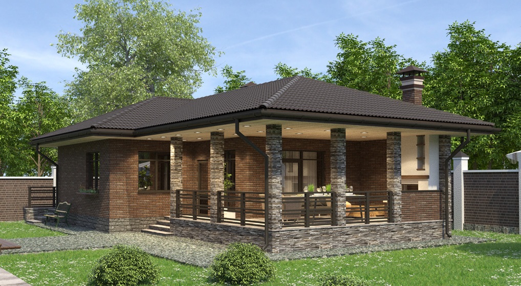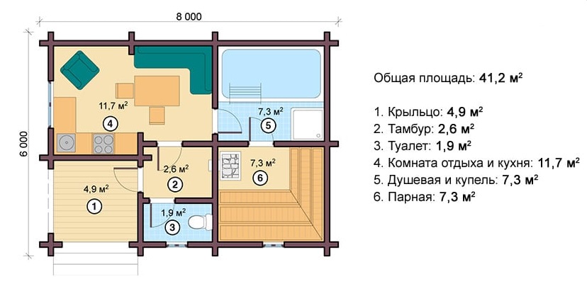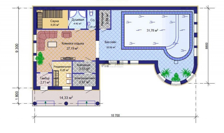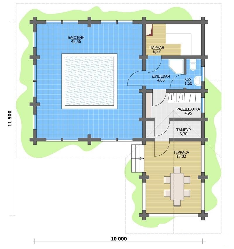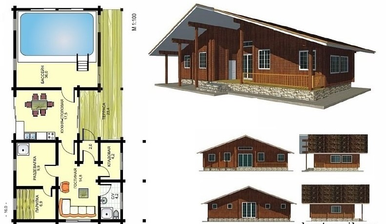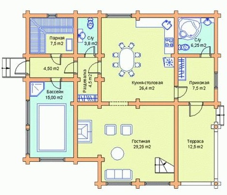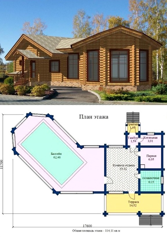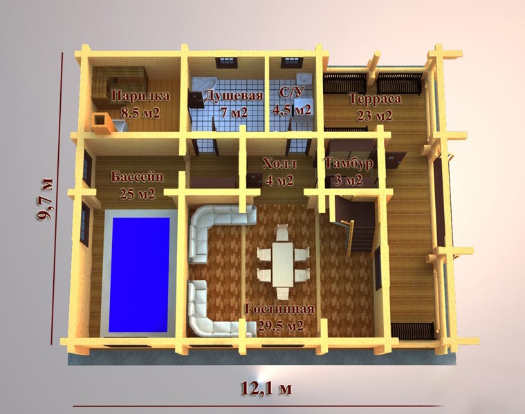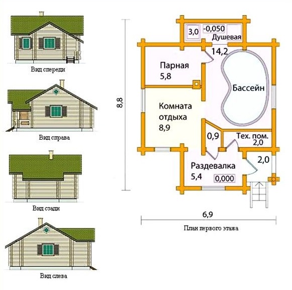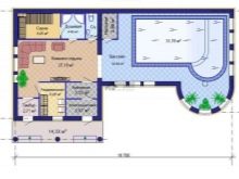 Cette option convient à la construction sur un site moyen.La disposition du réservoir est dans la rue, ce qui permet de gagner beaucoup de place dans le bain. La terrasse, si vous le souhaitez, peut émailler ou en faire un bâtiment pour la piscine.