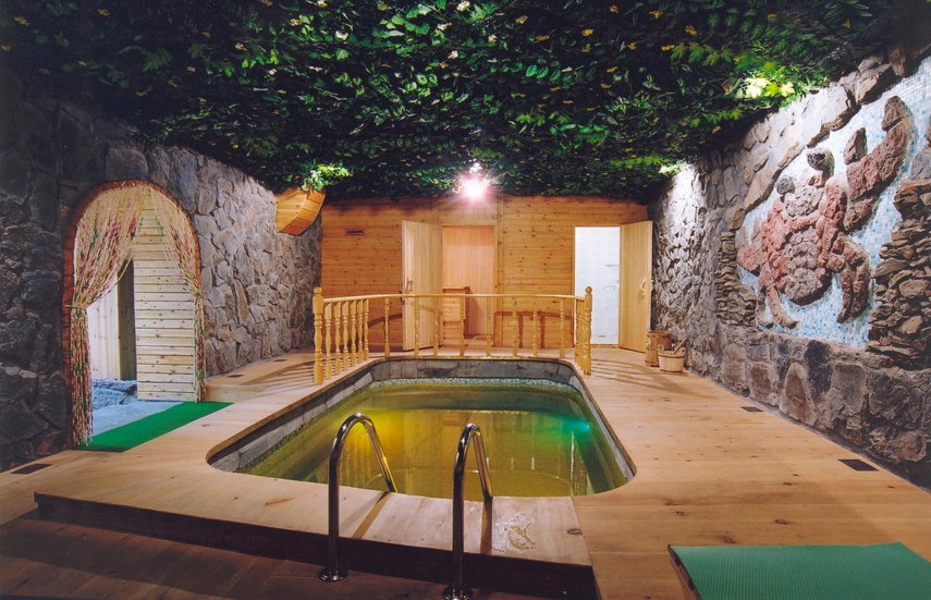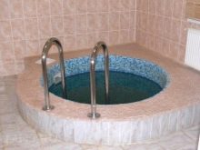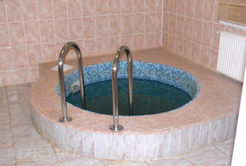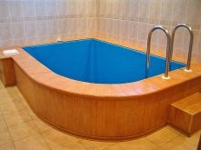 Cette option peut très bien s’intégrer dans une petite baignoire, mais elle devra construire une pièce séparée. Par conséquent, le propriétaire doit décider à l'avance s'il peut aménager un espace supplémentaire et s'il dispose de suffisamment d'espace sur la parcelle. Il est préférable de construire la piscine d'angle à proximité immédiate du hammam, de sorte que le trajet entre la pièce bouchée et l'eau fraîche ne prenne que quelques secondes.