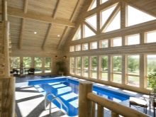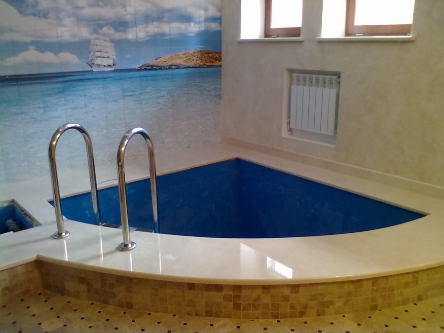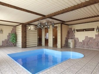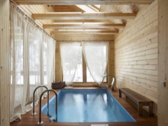 La piscine attenante au bain est bien fermée aux débris et à la poussière pénétrant dans l’eau. Un tel projet est également utile car pendant la saison froide, le réservoir peut être utilisé en raison du chauffage de la pièce. Afin de ne pas construire une extension séparée, vous pouvez utiliser le garage pour organiser la piscine.