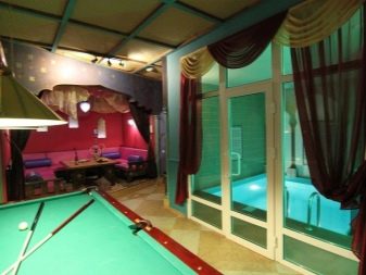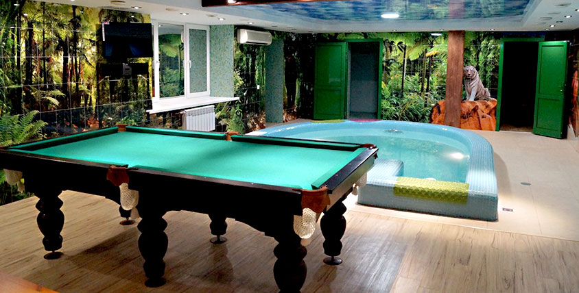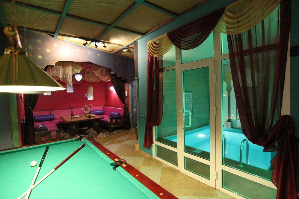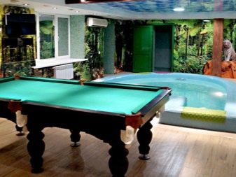 C'est une excellente solution pour combiner les procédures de bain avec la relaxation. Si la taille de la parcelle ne le permet pas, vous pouvez construire un bâtiment de deux étages, en plaçant au rez-de-chaussée un hammam, une salle d'attente et une salle de lavage, et au second espace de loisirs avec billard. Ce projet comprend l'emplacement de la cuvette à l'intérieur du bâtiment, qui fournit de l'eau chaude. Pour la construction d'une salle de billard dans le complexe de bains, il est nécessaire d'installer un système d'égout pour drainer les eaux usées et un four pour chauffer le grenier.