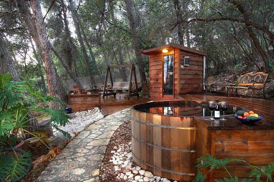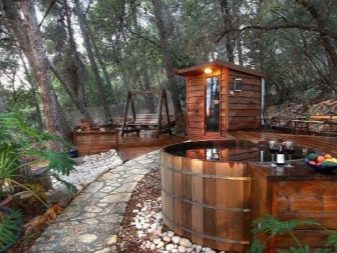 Sur Internet, vous pouvez trouver des idées inhabituelles pour construire un bain avec une piscine. La plupart d'entre eux impliquent de placer la police dans la rue à proximité immédiate du hammam. Cette piscine est protégée par des brise-vent sous forme d'arbres et d'arbustes. Des chemins de pavés sont aménagés autour du bol. Il est agréable de marcher dessus pieds nus et elle n'a pas peur de l'eau.