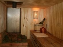 Voilà à quoi peut ressembler une salle de bain de haute qualité et de bonne qualité dans un garage. Presque toutes les surfaces sont faites de planches lisses en bois clair. Un mur de pierre sépare le hammam de la partie principale du four, seul un récipient contenant des pierres chauffées est amené à l'extérieur. La lampe n’est qu’une seule - en forme de diamant, au-dessus de la porte d’entrée (plus claire que les murs environnants).