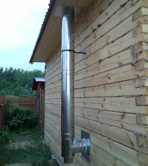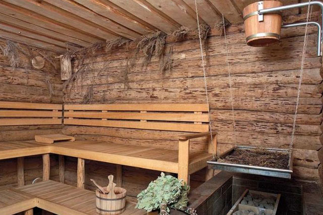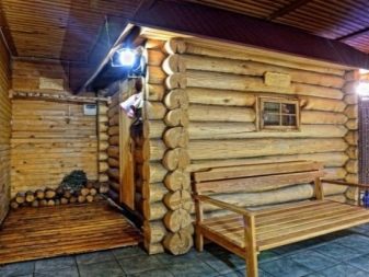 Voici un autre exemple - avec une cuisinière située dans le compartiment double lui-même. Les murs qui l’entourent sont garnis de pierre, le substrat est en pierre et le reste de la pièce est décoré de manière plus habituelle - avec des planches.La structure principale se présente sous la forme de marches, une imitation de maison en rondins est utilisée autour de la porte d’entrée.