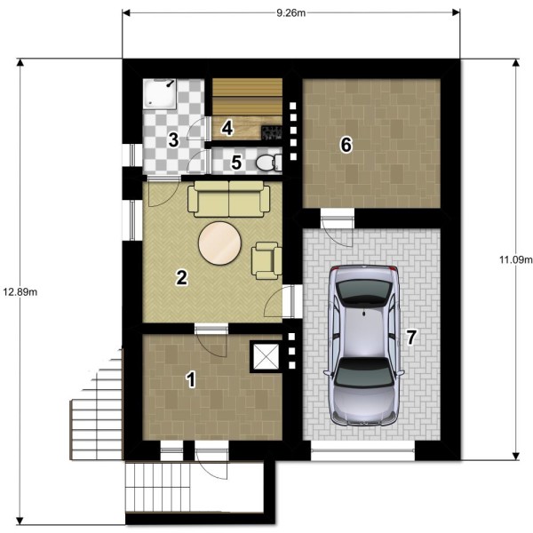 Dans la plupart des cas, les petites pièces donnent presque entièrement sous le garage et seule une petite surface est réservée au bain.