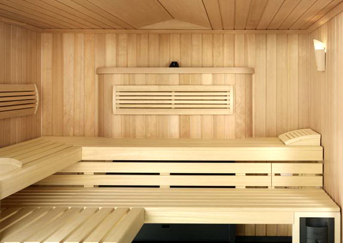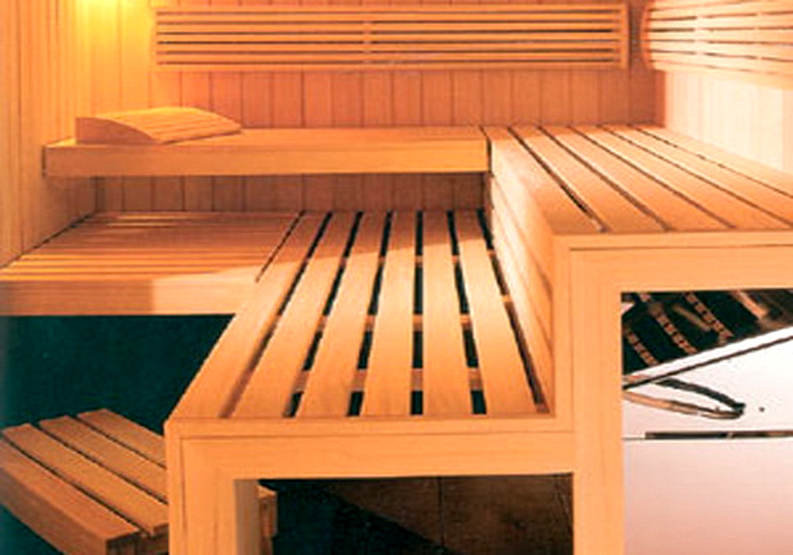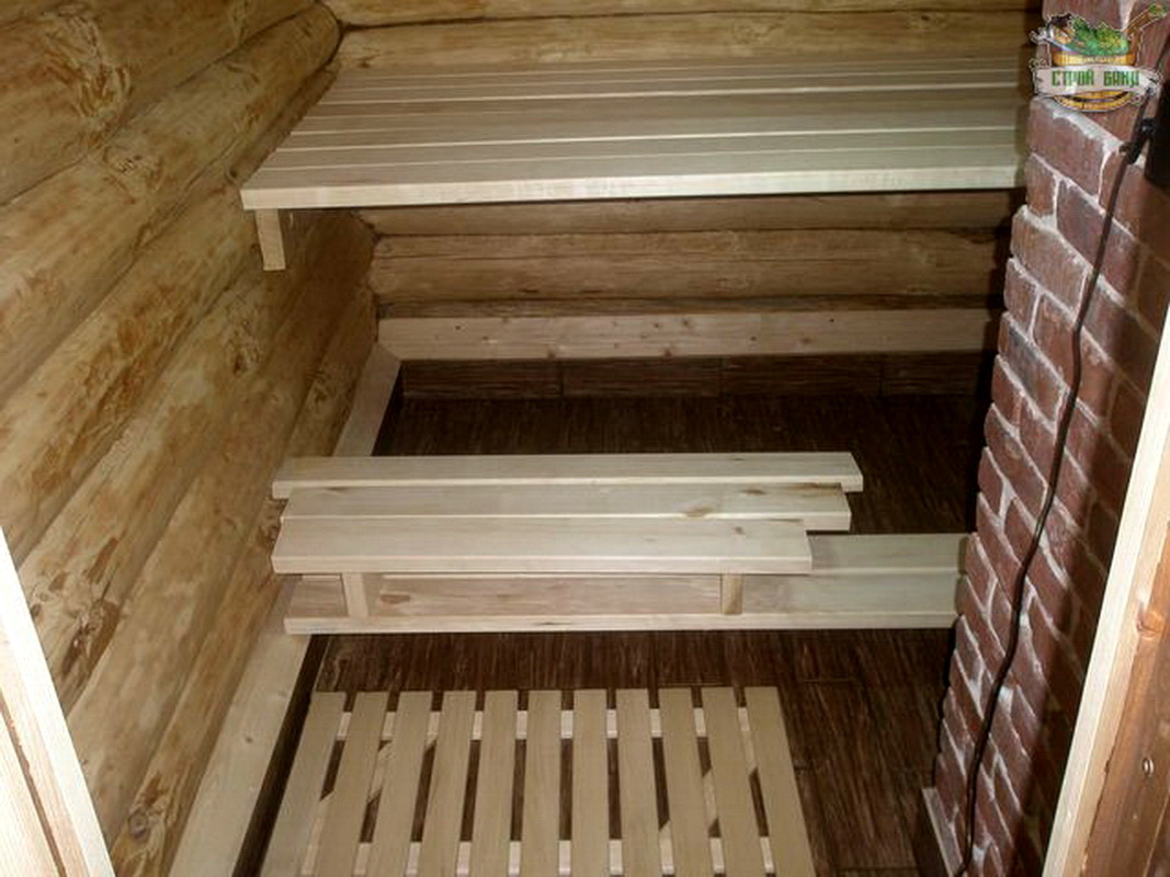 Le modèle de banc à trois niveaux est le plus approprié pour les grands hammams. L'étagère supérieure a les dimensions les plus grandes: sa longueur est d'environ 180 centimètres, sa largeur d'environ 60 centimètres. La distance entre le plafond et le niveau supérieur ne doit pas être inférieure à 120 centimètres. Cela est nécessaire pour que les visiteurs puissent être placés sur l'étagère du haut, à la fois assis et allongé.