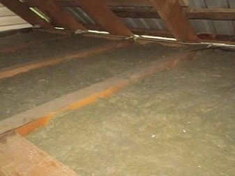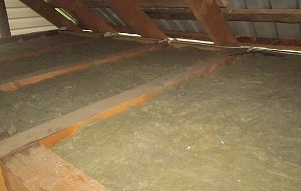 - En outre, du grenier dans l'espace entre les poutres, vous devez mettre une isolation. Notez que le matériau doit être posé correctement pour créer une couche dense sans espaces ni fentes.