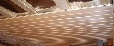 Dans ce cas, les panneaux sont fixés aux poutres de l'intérieur de la pièce, ainsi que du grenier. Dans ce cas, des matériaux isolants multicouches doivent être posés entre les revêtements de sol. Si vous avez un bon bain sur deux étages (grenier), la pose de l'isolant multicouche commence au rez-de-chaussée.
