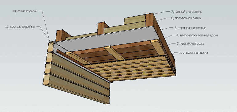 Bien sûr, vous pouvez utiliser du bois avec des imprégnations spéciales anti-moisissures et résistantes à l'humidité pour prolonger la durée de vie du matériau et pour vous protéger en cas d'installation incorrecte de l'isolant. Cependant, ces outils ne sont pas tout-puissants. Même si vous les posez sur les structures de plafond, elles se briseront sous l'effet constant de la vapeur et le bain devra être réparé.