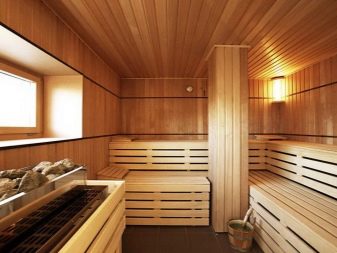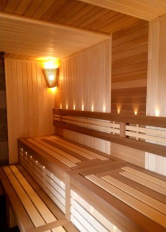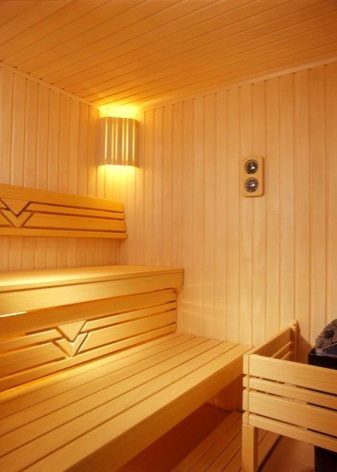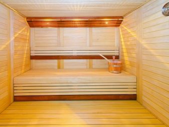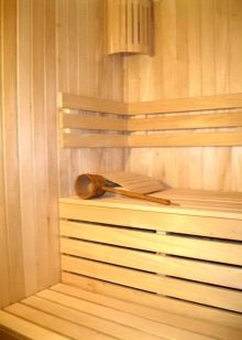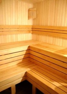En plus, clins de pin se distingue par son coût modique, aussi, certains experts l'achètent pour la finition du hammam. Un Pour se débarrasser des résines qui émettront du bois, le bain est chauffé plusieurs fois, et les substances libérées sur la base du matériau sont nettoyées à la spatule. L'inconvénient des produits à base de pin est qu'ils risquent de virer au bleu après un certain temps, ce qui affectera considérablement l'apparence de la pièce mais n'affectera pas la qualité du matériau.